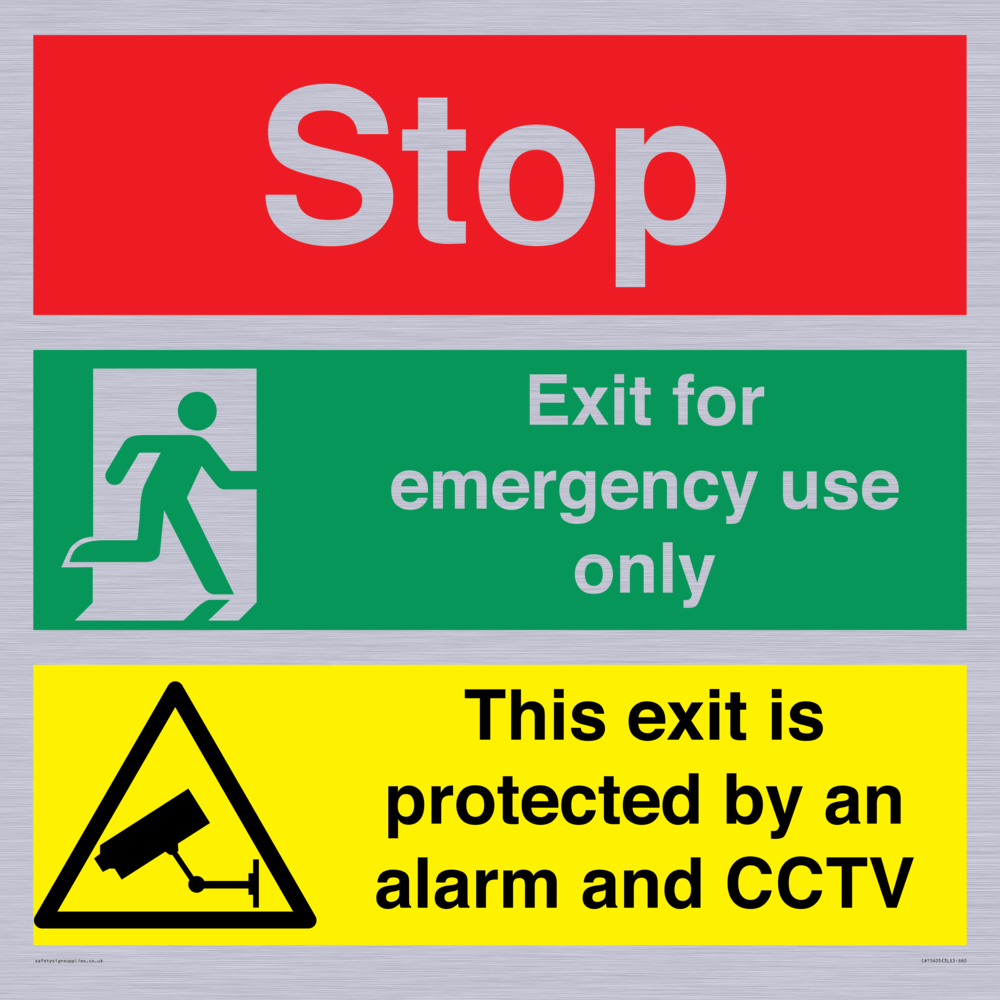 Stop. This Exit for emergency use only. This exit is protected by an alarm and CCTV. Multi sign for emergency exit doors with additional security measures