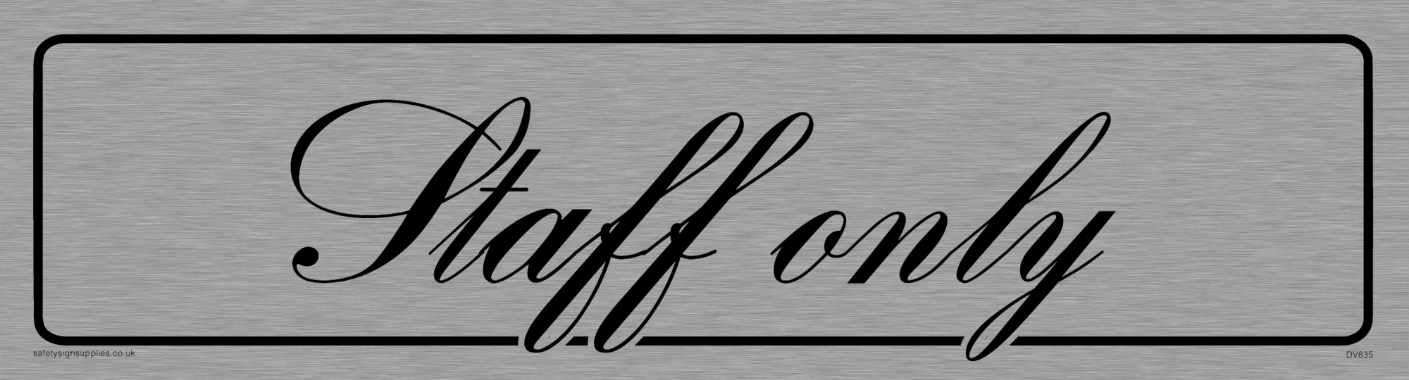 "architectural - staff onlyoffice door sign with brushed metal finish / background, text in flowing fine script positive, black font - bank script"