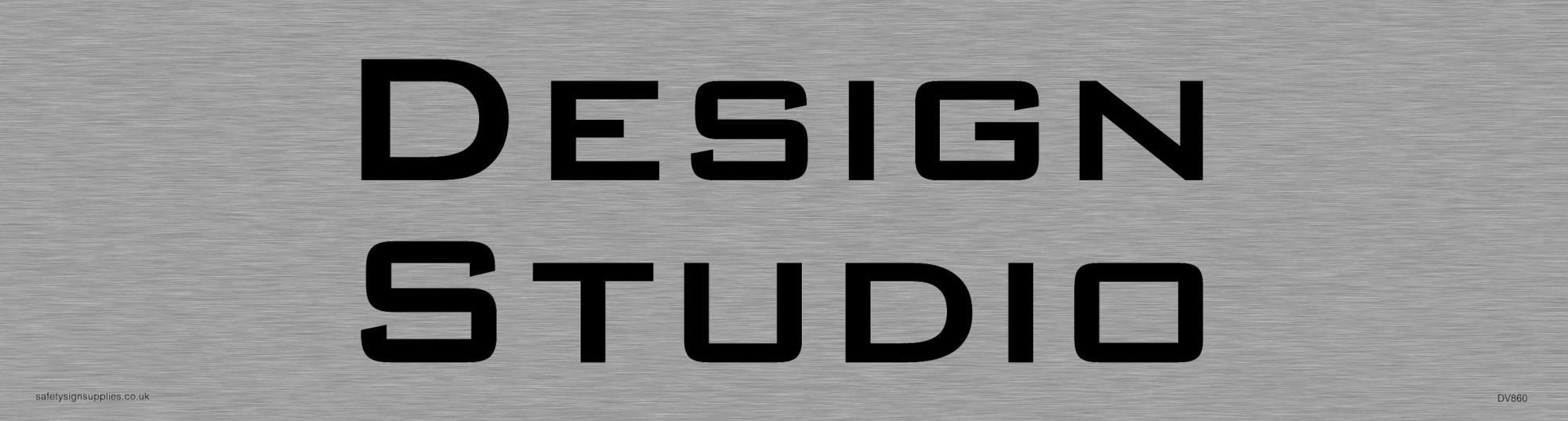 "architectural - design studio office door sign with brushed metal finish / background, text in modern bold positive, black font - bank gothic medium"