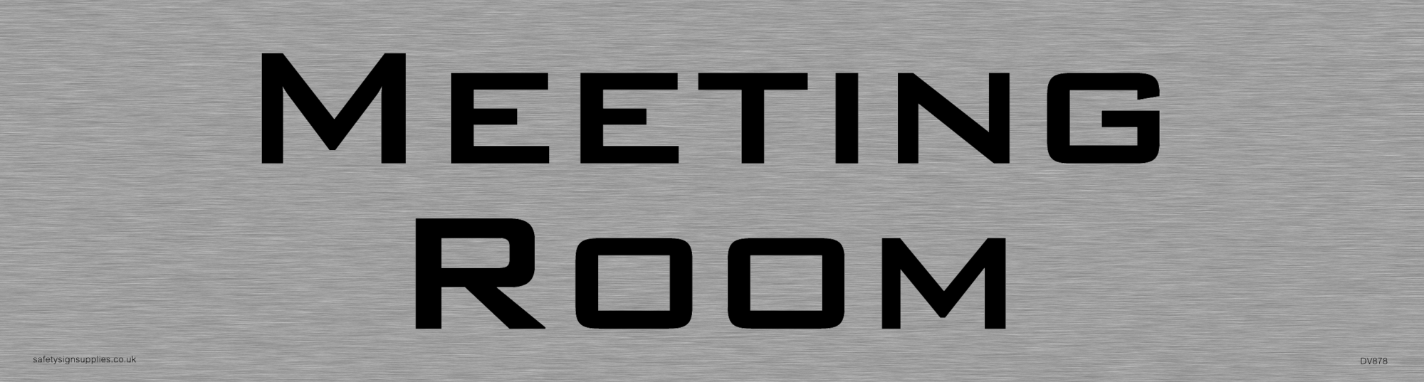 "architectural - meeting room office door sign with brushed metal finish / background, text in modern bold positive, black font - bank gothic medium"