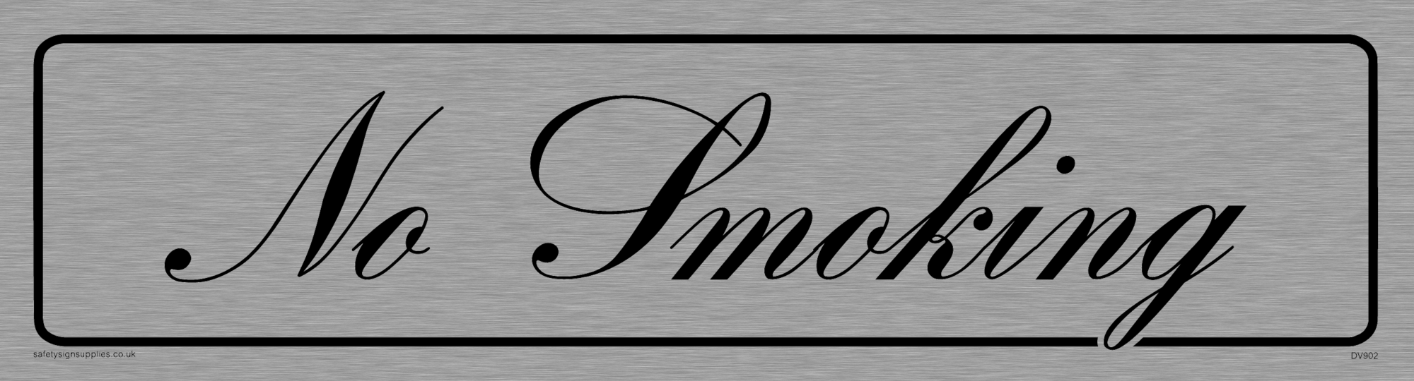 "architectural - no smoking sign with brushed metal finish / background, text in flowing fine script positive, black font - bank script"