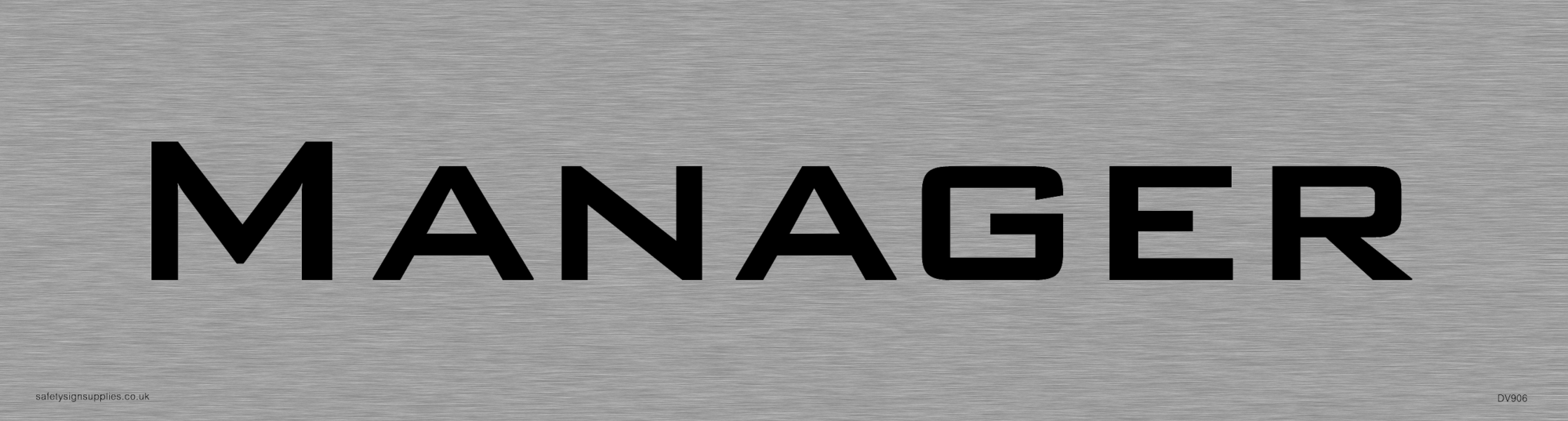 "architectural - manager office door sign with brushed metal finish / background, text in modern bold positive, black font - bank gothic medium"