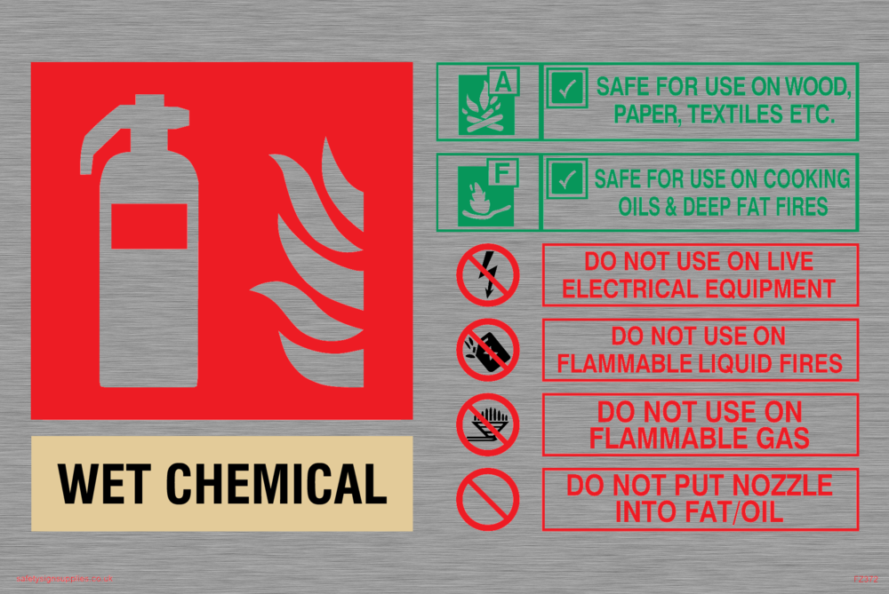 "WET CHEMICAL SAFE FOR USE ON WOOD, PAPER, TEXTILES, ETC. SAFE FOR USE ON COOKING OILS & DEEP FAT FIRES. DO NOT USE ON LIVE ELECTRICAL EQUIPMENT DO NOT USE ON FLAMMABLE LIQUID FIRES DO NOT USE ON FLAMMABLE GAS DO NOT PUT NOZZLE INTO FAT/OIL"