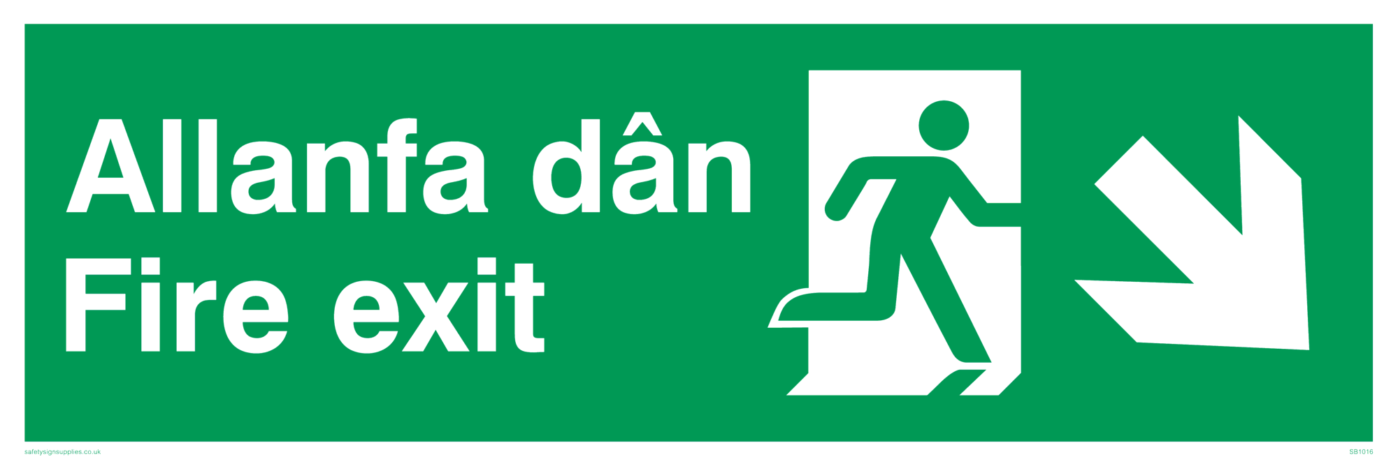 bi-lingual - welsh / english with running man symbol facing right and arrow pointing diagonally down and right