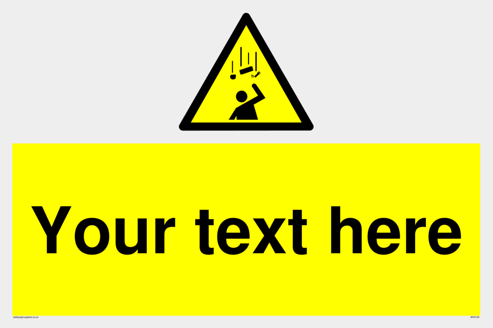 Custom Falling Objects Sign. Add your own custom text. Normal delivery times apply. Yellow Falling Objects Symbol. This symbol and sign layout complies with new EN7010 legislation that governs safety signs.