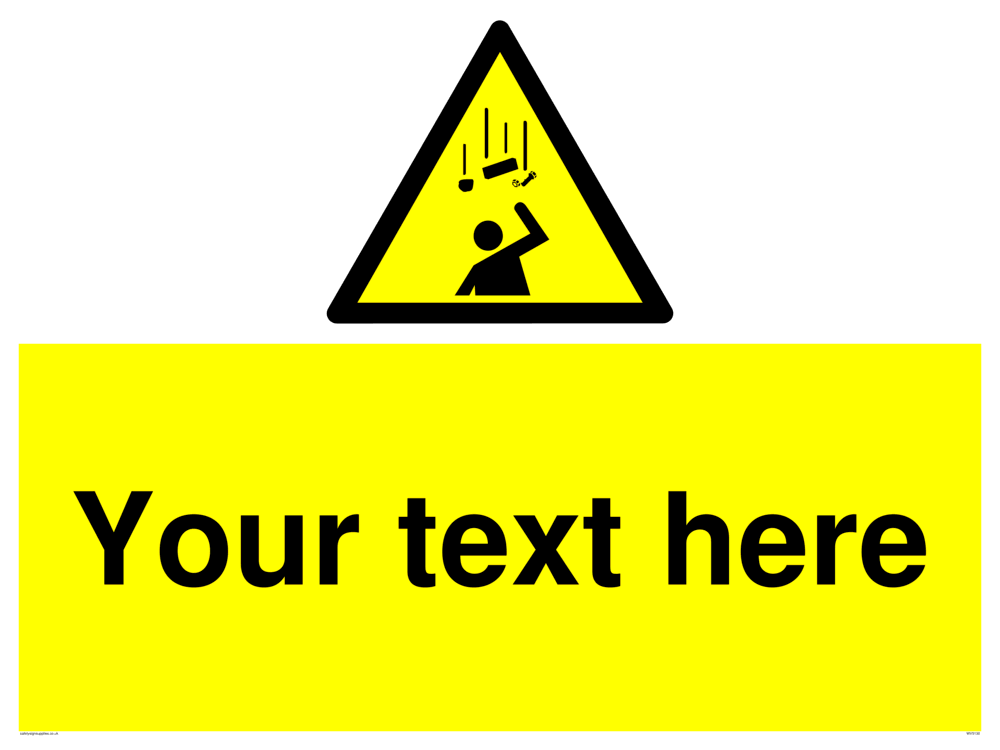 Custom Falling Objects Sign. Add your own custom text. Normal delivery times apply. Yellow Falling Objects Symbol. This symbol and sign layout complies with new EN7010 legislation that governs safety signs.