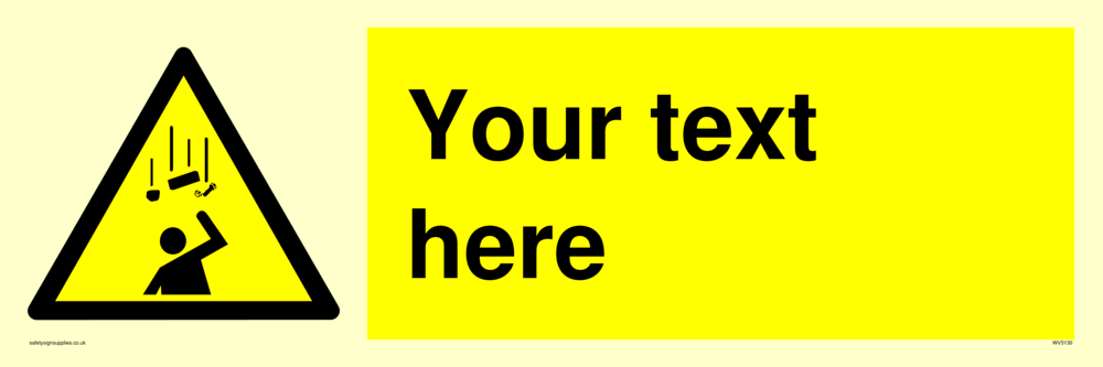 Custom Falling Objects Sign. Add your own custom text. Normal delivery times apply. Yellow Falling Objects Symbol. This symbol and sign layout complies with new EN7010 legislation that governs safety signs.